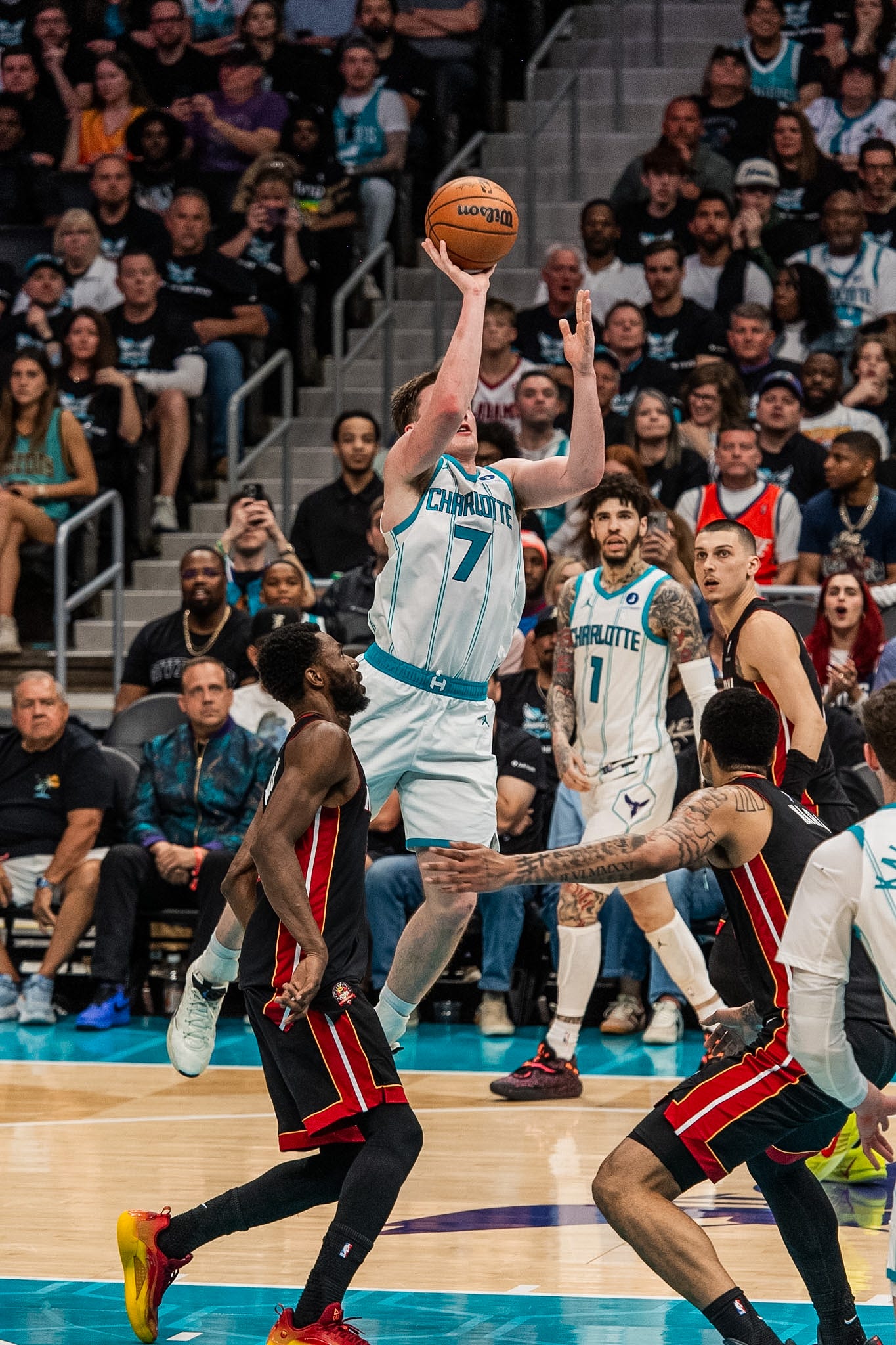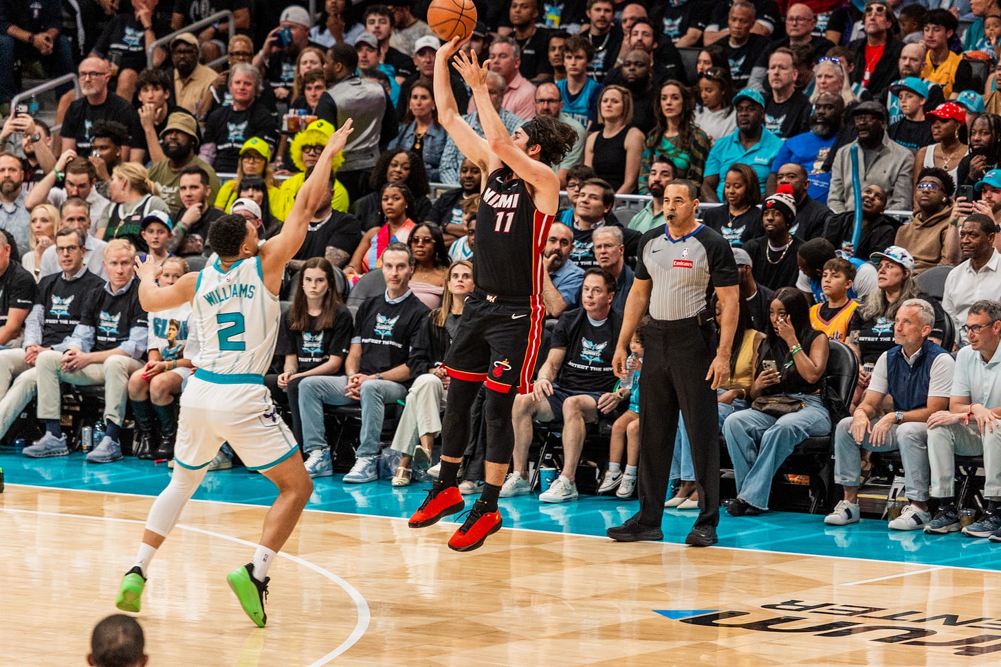 The first half was a back and forth affair, with the Hornets going up 26-18 late in the 1st quarter before Miami closed the period on a 6-0 run to draw within two points heading into the 2nd quarter. Barely a minute of game time later, Miami suffered a serious blow when an injured Bam Adebayo left the game for good at the 10:58 mark after Ball appeared to grab his ankle while lying on the ground, causing Adebayo to fall hard to the court. Brandon Miller then picked up his third foul on an illegal screen with 9:09 and sat the rest of the half, which ended with the Heat holding a slim 54-52 lead.