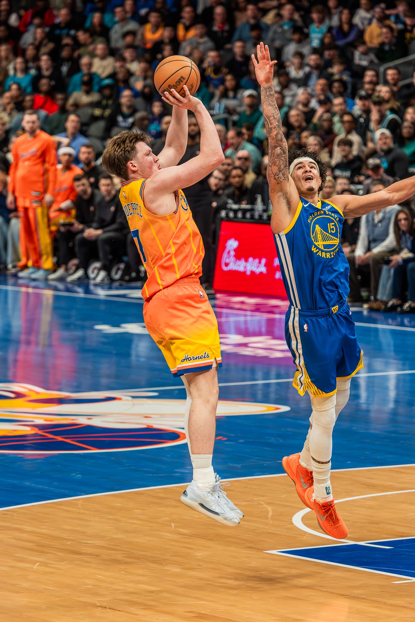 After the Hornets raced to a 10-3 lead in the first quarter, Golden State was able to find their rhythm to quickly get back on even footing. With both teams moving the ball up the court quickly and getting up quick shots, the high-scoring quarter ended with Golden State and Charlotte knotted up at 30.